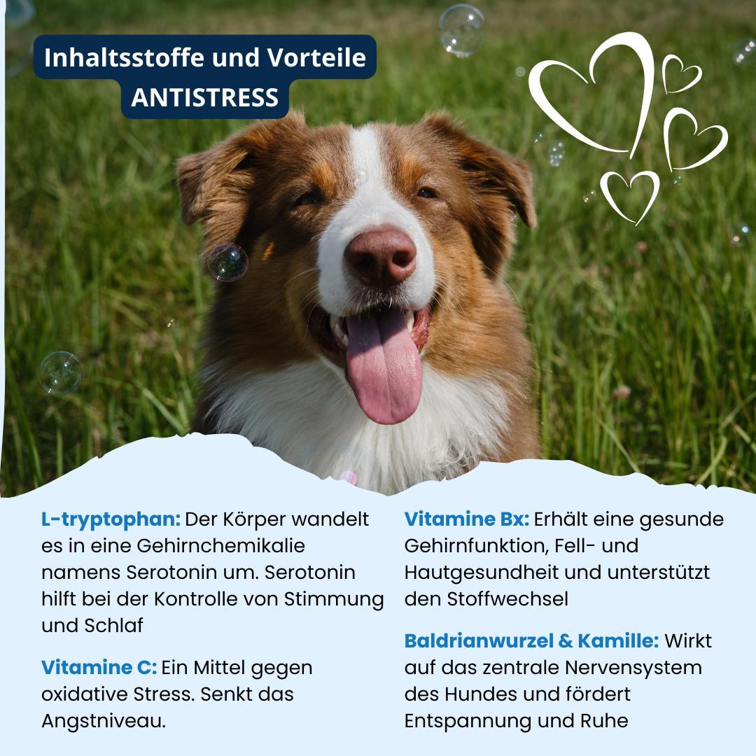 Verwenden Sie die Anti-Stress-Vitamine als sicheren Teil der täglichen Pflege Ihres Hundes, um seine Nerven zu stärken und ihm zu helfen, mit alltäglichem Stress gesund umzugehen – ohne Risiko von Abhängigkeit oder Sedierung.